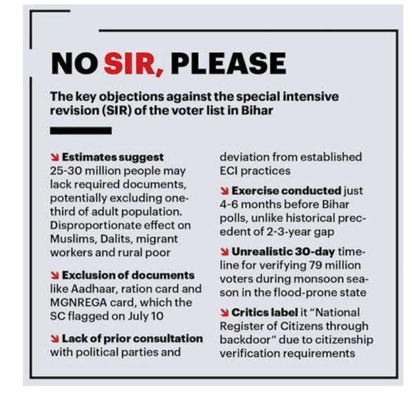 - One of the most prominent concerns revolves around the Special Intensive Revision of Electoral Rolls in Bihar, which has been criticized for lacking transparency.