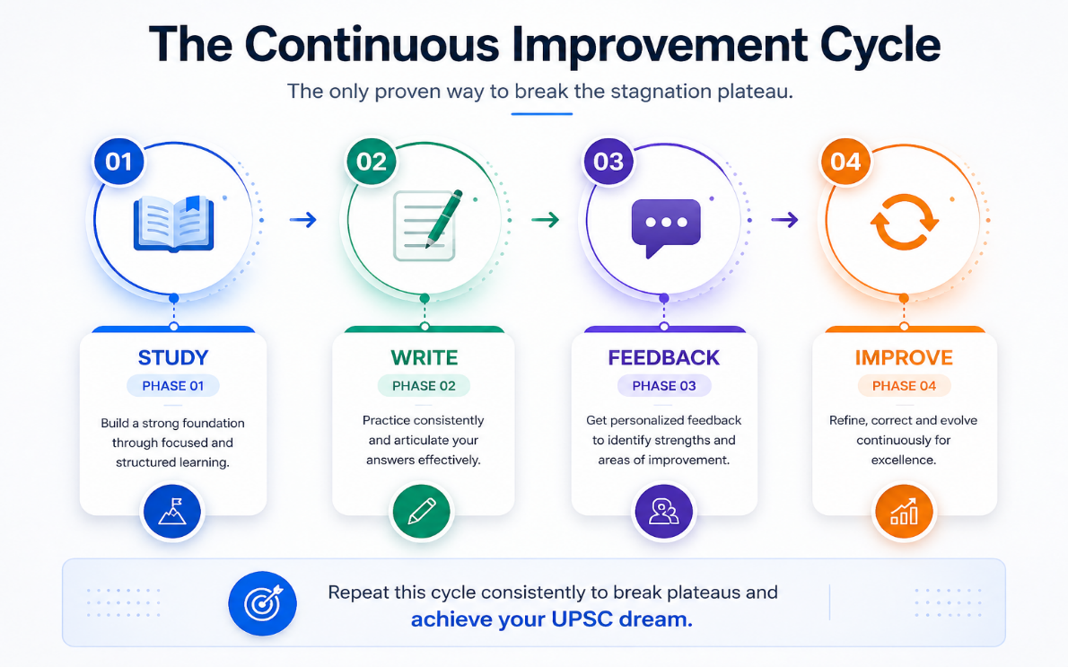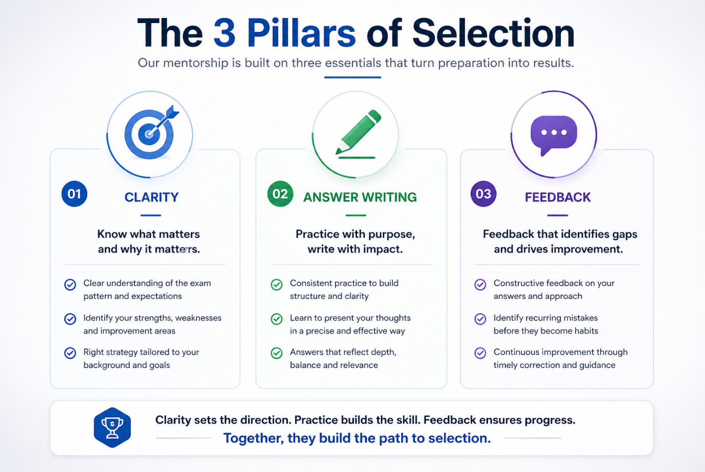 Often, small issues create larger problems — writing without addressing the demand of the question, adding content without structure, or missing clarity in basic concepts. These are not always visible to the aspirant while studying alone.